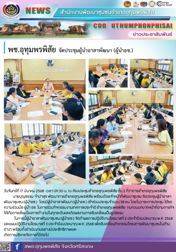 นายบุญธรรม จำปาสุข พัฒนาการอำเภออุทุมพรพิสัย พร้อมด้วยนายธีรพล สุภาทิพย์ นักวิชาการพัฒนาชุมชนปฏิบัติการ จัดประชุมผู้นำอาสาพัฒนาชุมชน (ผู้นำอช.) โดยมีผู้นำอาสาพัฒนา (ผู้นำอช.) เข้าร่วมประชุมจำนวน 38 คน โดยในวาระการประชุม ได้ขอความร่วมมือ ผู้นำ อช. ในการร่วมกิจกรรมงานเทศกาลประจำปี อำเภออุทุมพรพิสัย ทบทวนบทบาทหน้าที่ตามภารกิจ ให้เกิดการเชื่อมโยงการทำงานในทุกระดับและเกิดผลงานการขับเคลื่อนเป็นรูปธรรม