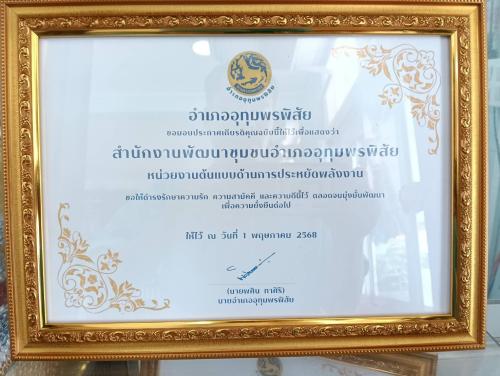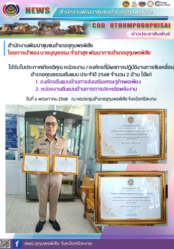 ได้รับใบประกาศเกียรติคุณ หน่วยงาน /องค์กรที่มีผลการปฏิบัติงานการขับเคลื่อนอำเภอคุณธรรมต้นแบบ ประจำปี 2568 จำนวน 2 ด้าน ได้แก่